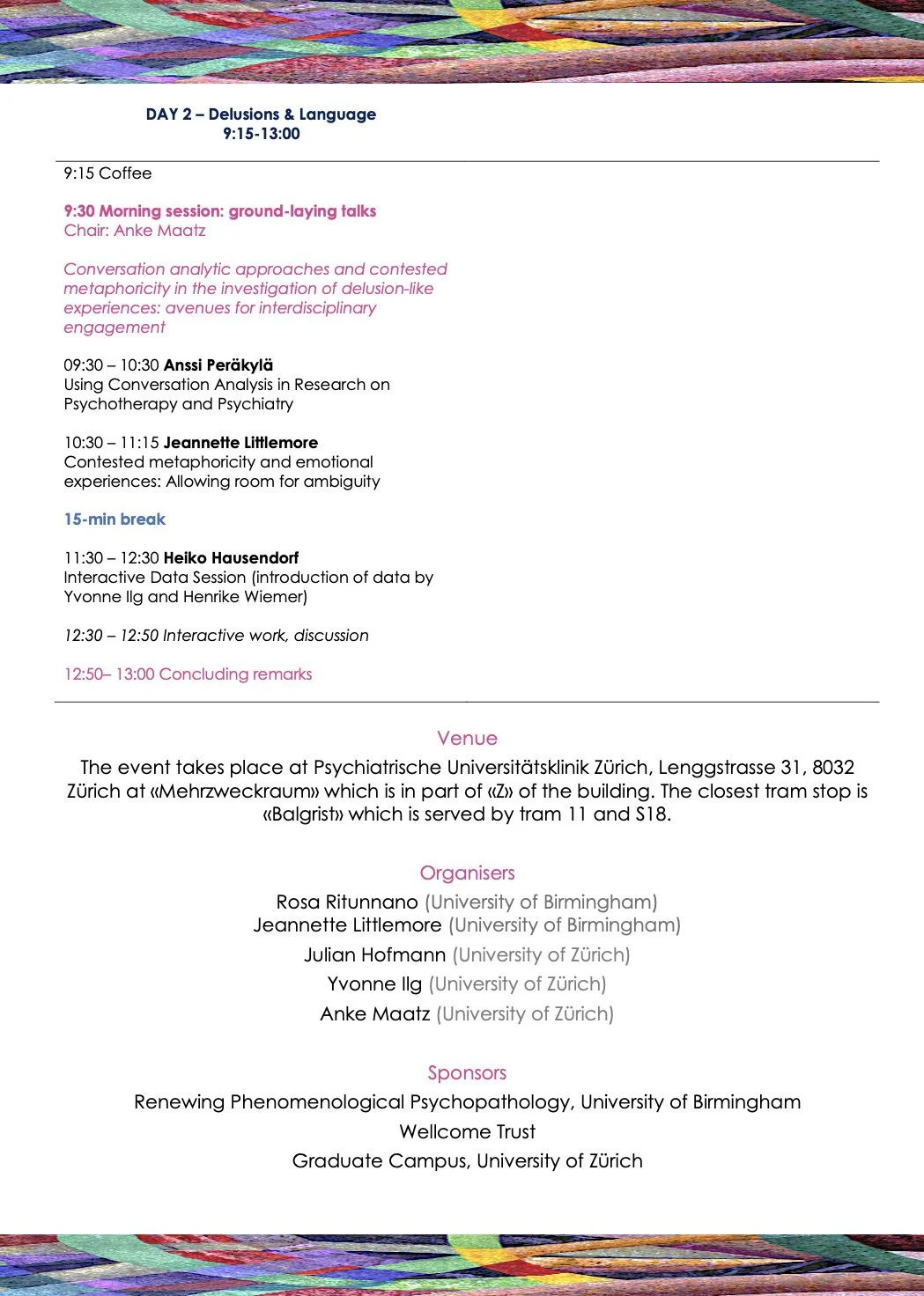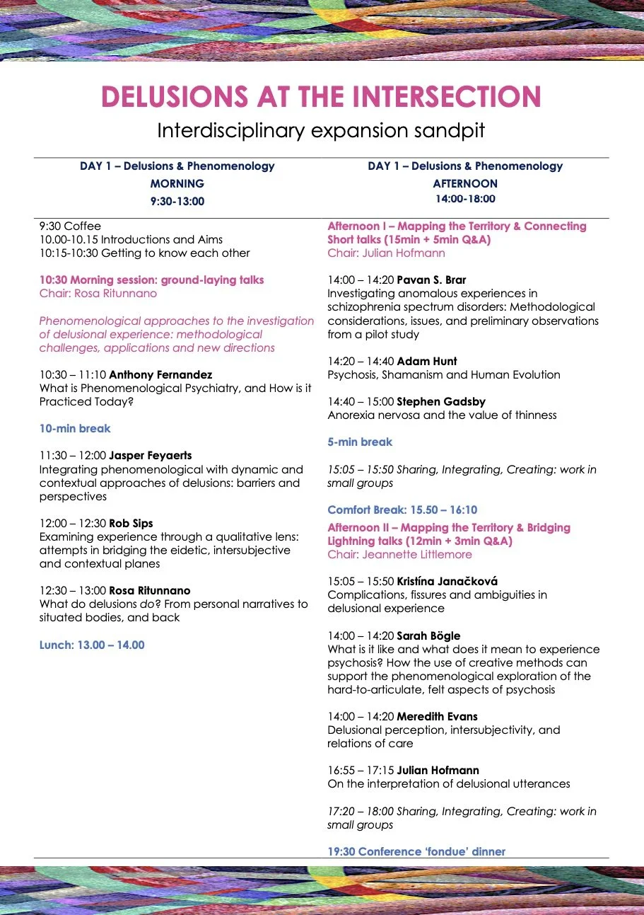 The aim of this workshop is to move beyond the traditional conceptualisation of delusion as ‘dysfunctional belief’ and open up a new trans- and inter-disciplinary space for methodological development and theoretical cross-pollination.