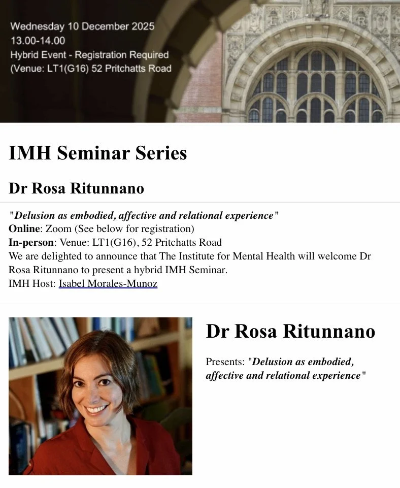 Ritunnano, R. * (2025). “"The embodied, affective, and narrative world of delusions". Presented online at the Fourth instalment of The Salon, Departments of Psychiatry, Public Health, and Neuroscience at the University of Illinois at Chicago, April 14, 2025. *Invited